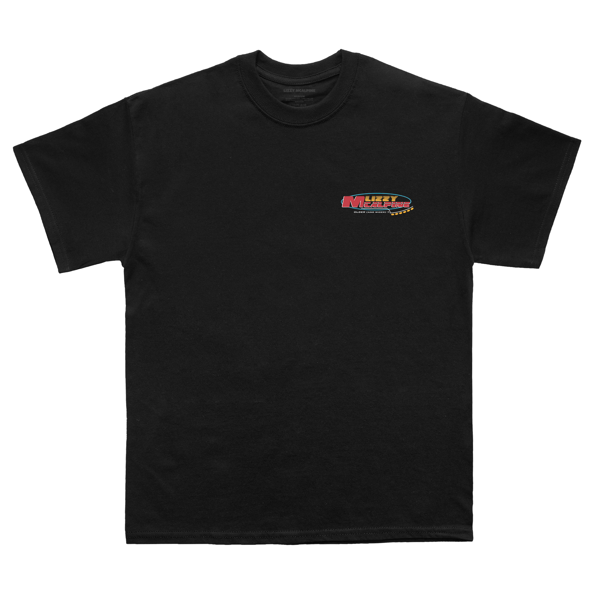 A unisex black tee featuring logo design printed on the front and guitar graphic on the back.