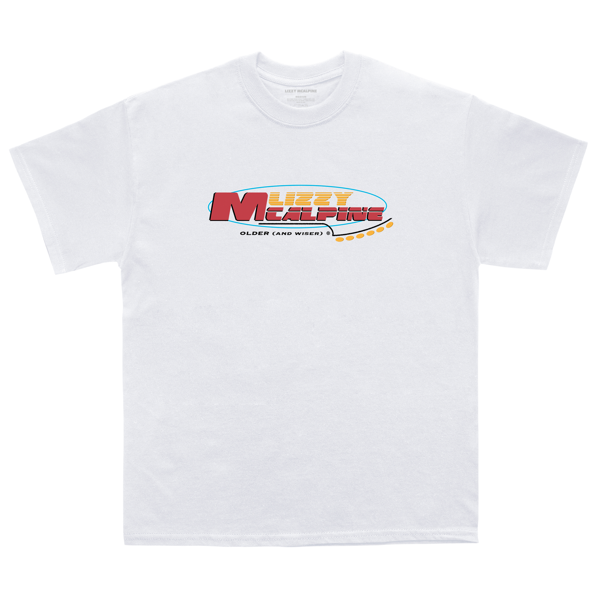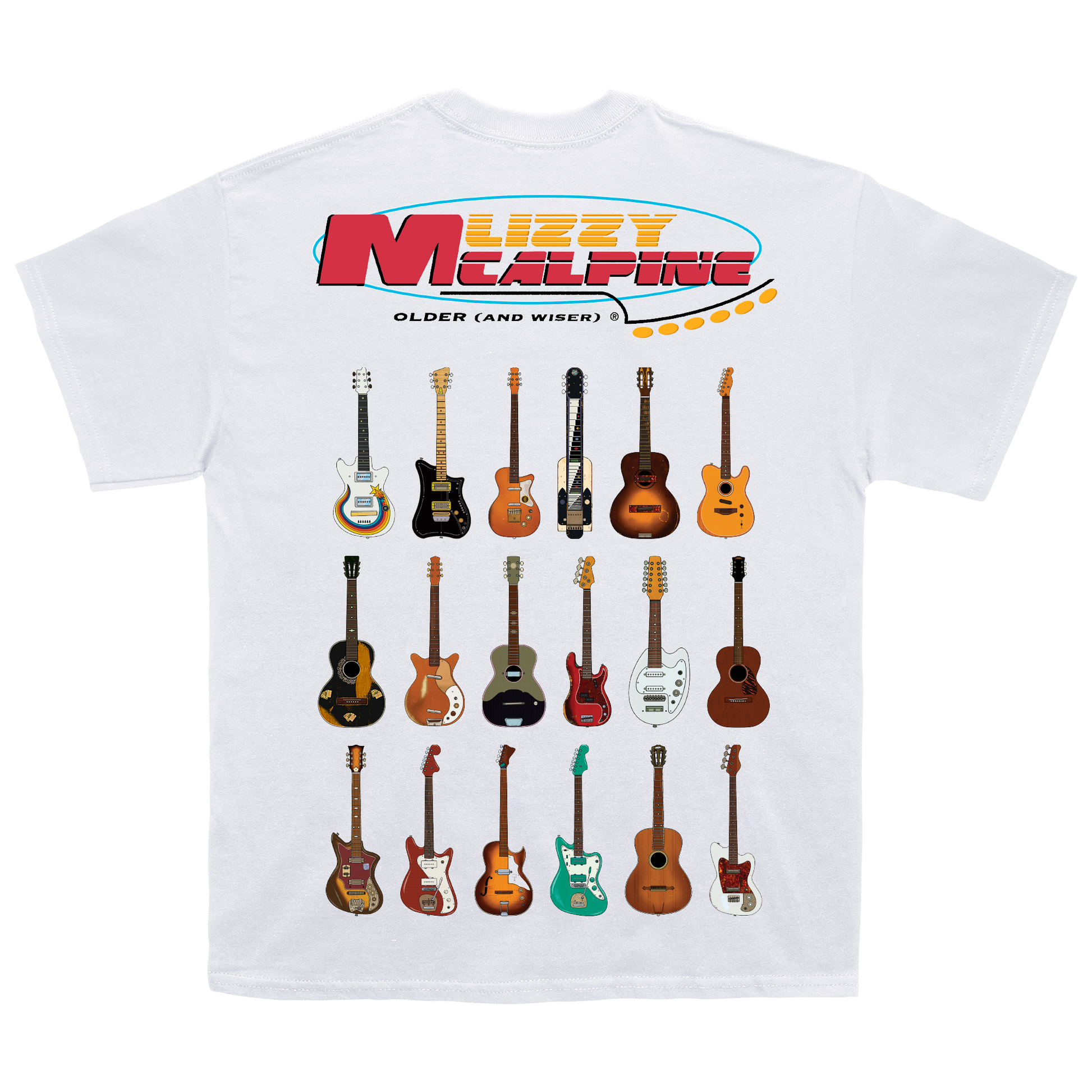 A unisex white tee featuring logo design printed on the front and guitar graphic on the back.